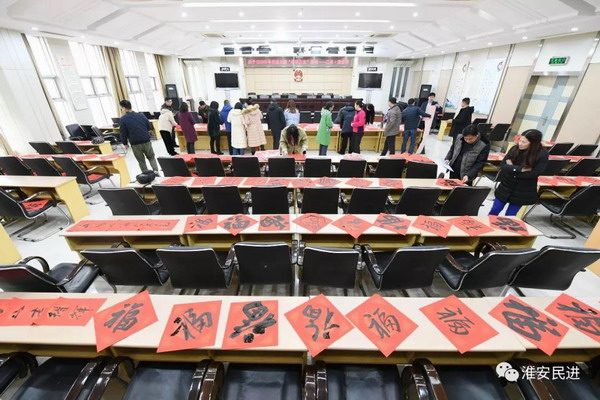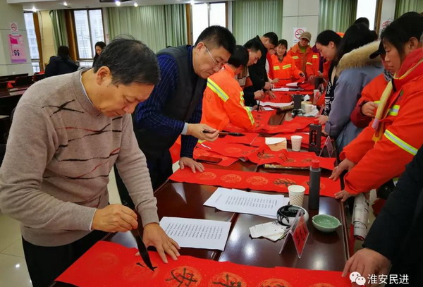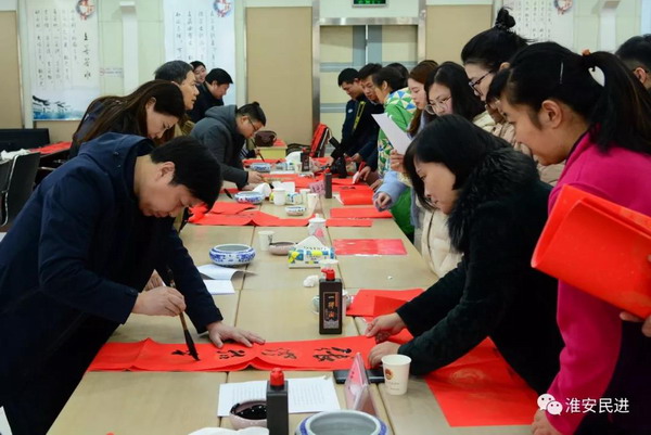 “春联万家”活动是由民进中央主办的一项全国性的文化惠民活动,旨在发挥民进文化界别优势服务社会,弘扬中华传统文化,引导基层文化建设。每年春节前夕,民进淮安市委按照民进中央要求和民进省委部署,积极组织会内书画家走进基层,为我市各界群众送去民进的“新春祝?!?,增添欢乐的节日氛围,赢得了社会广泛赞誉。
