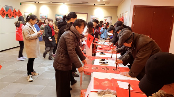 1月7日下午,由民进镇江市文化支部承办的“春联万家”活动在镇江市迎江路社区康乃馨日间老年人照料中心举行?;舛暾笳蟆⒑庀耍疃殖∪词侨饶址欠?、墨香飘荡。郭涛、陈海宁、蔡鹏飞、蔡伟、翟爱萍等多位书画家参加了活动。一副副春联、一张张“?!弊郑褂薪承亩谰叩南笮巍笆蟆弊治酥诙嗾樟现行哪诘睦先撕凸ぷ魅嗽币约案浇叛抖吹氖忻?。2个多小时里,书画家们共创作了200多副春联和100多张“?!弊帧?月8日上午,由镇江民进书画研究会承办的“春联万家”活动在镇江启迪协信太古城1楼中庭举行,现场人声鼎沸,人气爆棚。叶国勤、戴静和、陈海宁、张新东、程宏文、周青等民进会内外6位书画家快马加鞭,共创作了350多幅对联和400多张“?!弊郑庑┳髌泛芸毂晃叛抖恋闹诙嗍忻瘛耙磺蓝铡?。